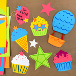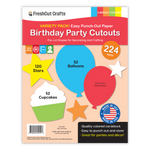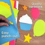 This pack includes 36 sheets of punch-out paper birthday decorations featuring paper balloons, cupcakes, and star shapes in our bright color palette. Each shape is pre-cut from sturdy, double-sided cardstock paper and punches out cleanly—no scissors needed, no mess, just easy birthday crafts that spark creativity.