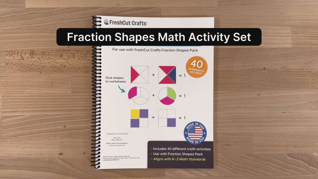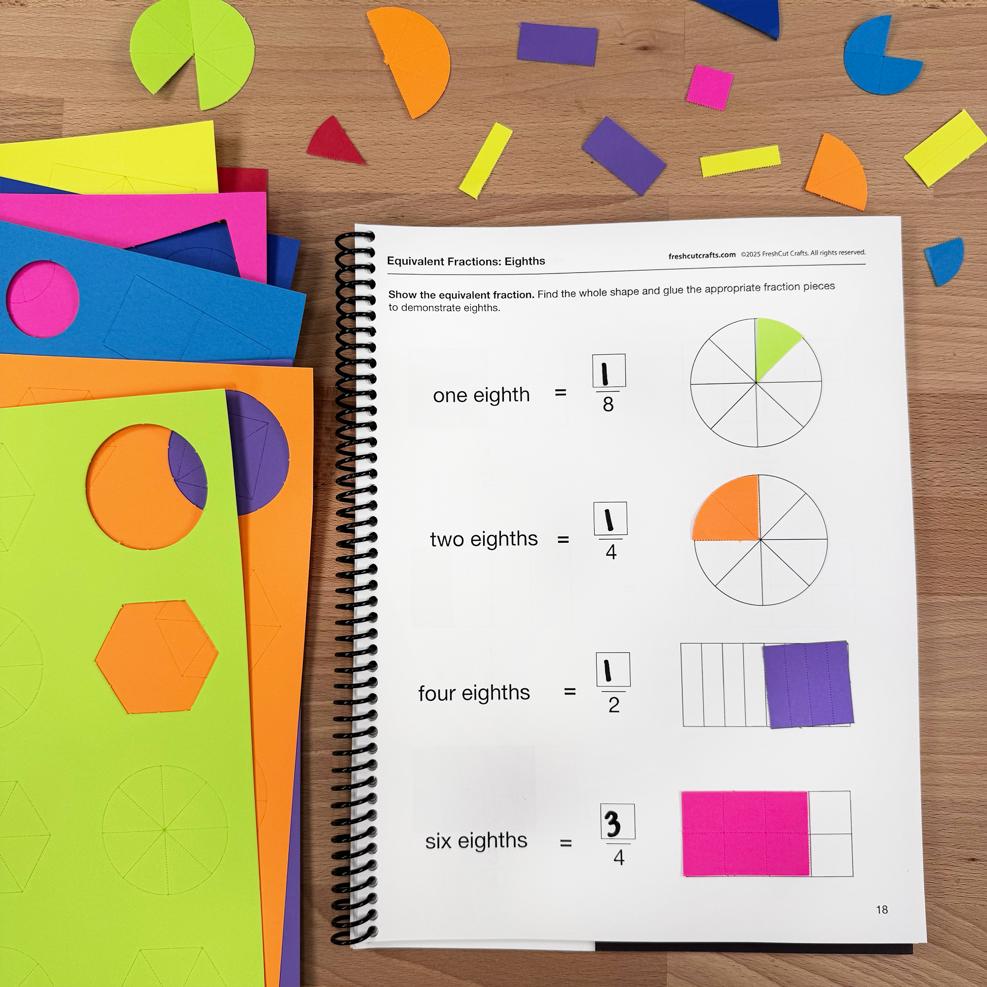 Get 10 geometric shape designs (384 pieces) with easy-tear perforated lines to separate the shapes into fractional elements. The shapes are designed to reinforce all of the benchmark fractions, including halves, thirds, quarters, sixths, and eighths. Workbook includes 40 activity sheets that are tied to key National K-3 Math Standards and Essential Skills.